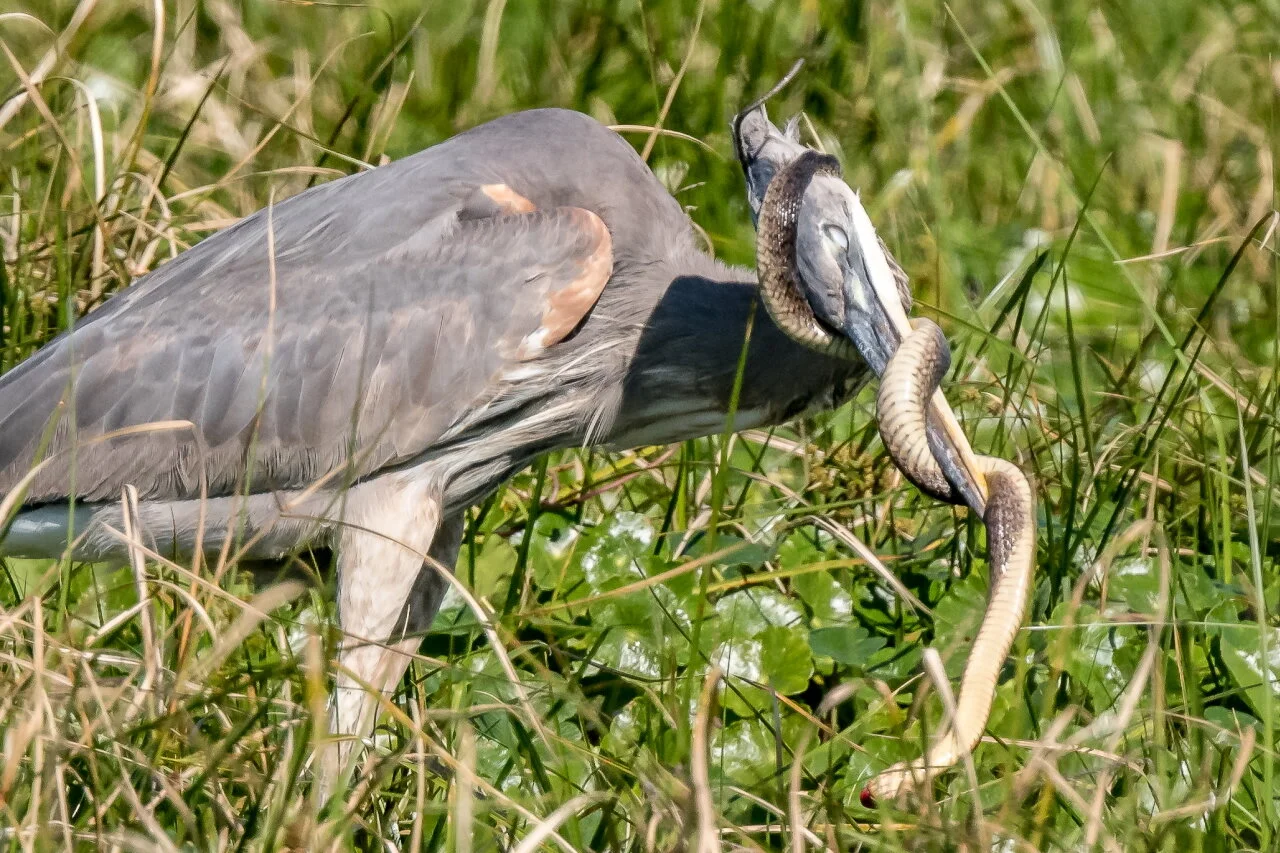 For we humans, secure in the comfort of our homes and our society, it is only when we encounter an incident like this between a predacious Great Blue Heron and a poor hapless snake (considering most folks view of snakes, “poor” and “hapless” are not adjectives one usually ascribes to them) that we realize that such dramatic events must occur billions of times every day. Prey species are out there peacefully going about their business finding food, raising young, being cute, and sometimes even adorable, when a Big Bad Wolf predator comes along, just going about its own business, which is simply trying to stay alive as well.